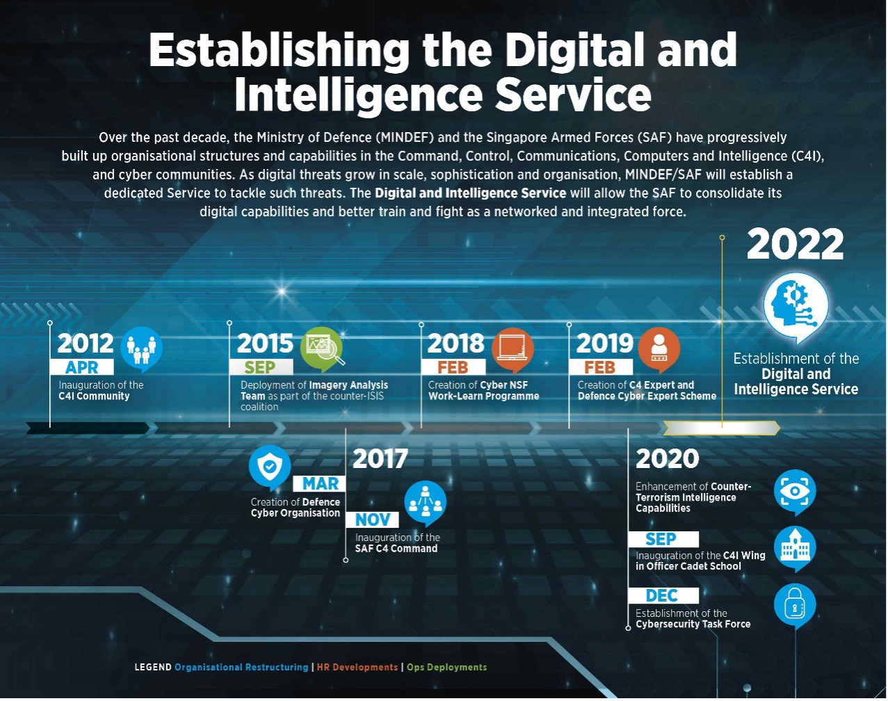 The digital domain has grown into a full-fledged arena of conflict and contestation. Threats that emanate from the digital domain can readily impact events in the physical world. However, these digital threats have continued to grow in scale, sophistication and organisation. Therefore, MINDEF/SAF set up a fourth Service, the Digital and Intelligence Service (DIS), which more tightly integrates the SAF’s capabilities across the Services to deal with a spectrum of security threats, including those from the digital domain. The DIS will provide enhanced intelligence, advanced connectivity and resilient digital defence for the SAF. As a force with specialisations in core technology areas and communications, and across diverse areas such as data science, psychology, linguistics, anthropology and geography, the DIS will accelerate the SAF’s Next Generation transformation efforts.